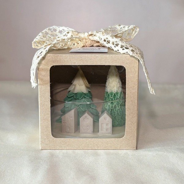 Cilindo de vidrio con 2 velas pinos y casitas.